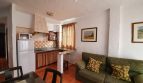 Apartamento con aire acondicionado, terraza privada con vistas a las montañas y a la piscina, zona de estar y de comedor con TV y chimenea, 1 dormitorio con cama doble y otro con 2 camas individuales, una cocina con vitrocerámica, microondas y nevera, baño privado y lavadora.